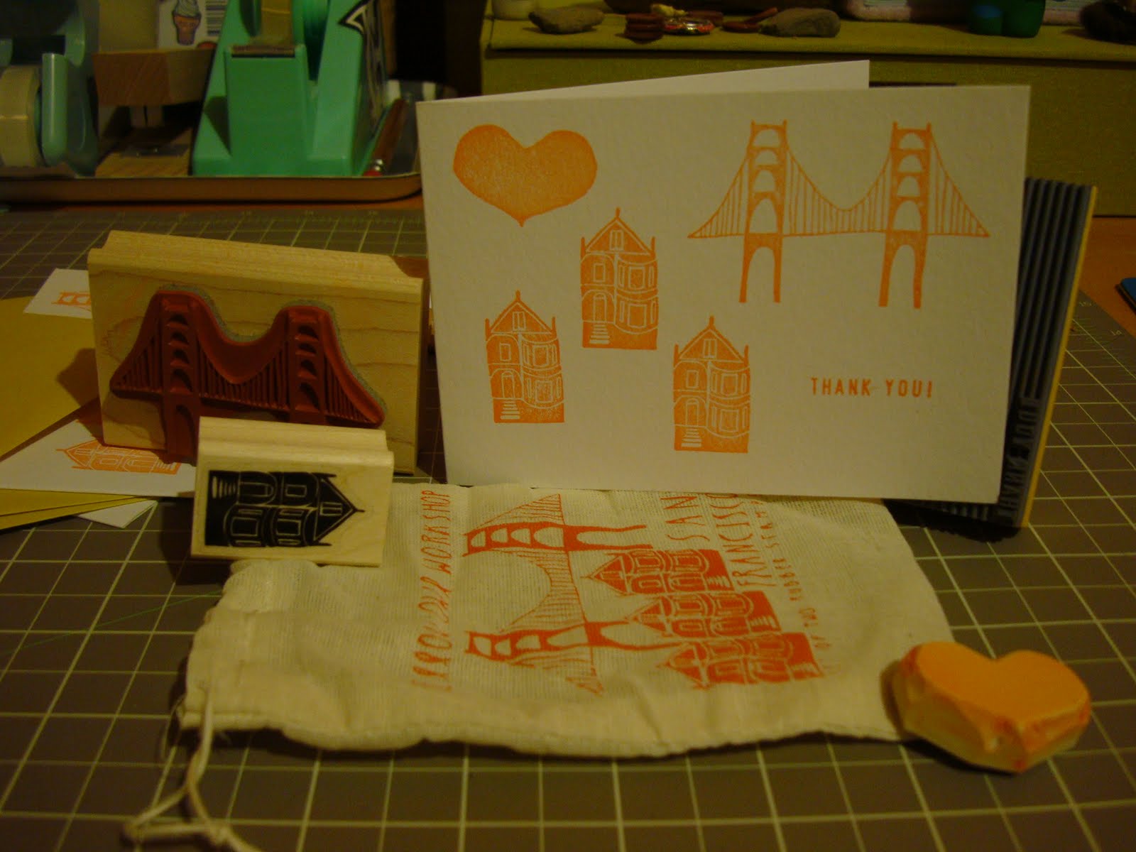 I made some thank you cards, for some great people who helped celebrate my birthday with me. The Golden Gate Bridge and home stamp is a set from Yellow Owl Workshop (whom I just adore. See here and here.) I picked it up as my souvenir at DeYoung. I also used one of my carved heart blocks and a stamp kit I got at the local office store. Love the orange. Go Giants!
